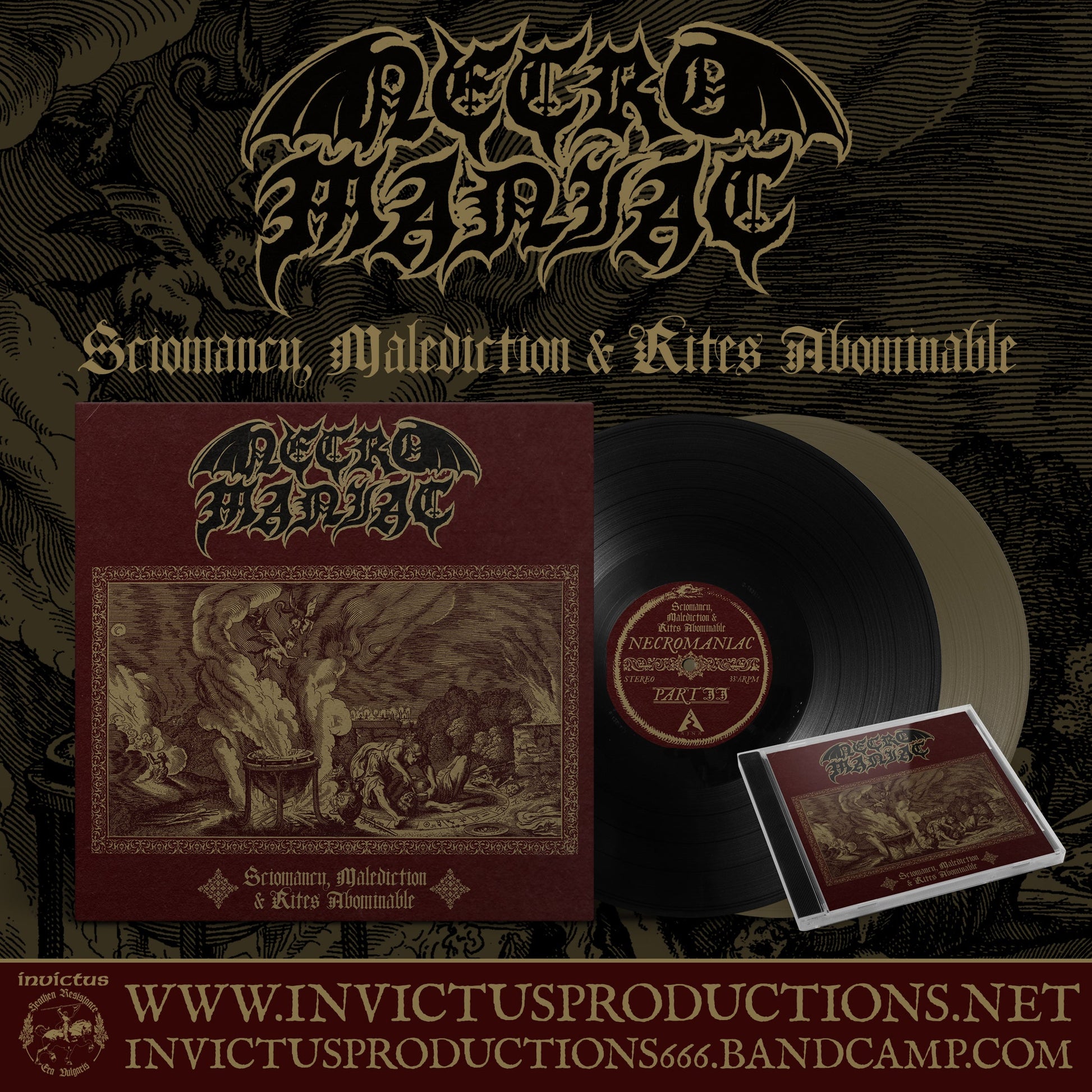 INVICTUS PRODUCTIONS in conspiracy with THE AJNA OFFENSIVE are proud to present NECROMANIAC's long-awaited debut album "Sciomancy, Malediction & Rites Abominable" on DIGITAL, CD & LP formats. INVICTUS will handle the album's release for Europe while AJNA will handle its North American release. The CD & DIGITAL versions are scheduled for release on January 13th 2025 to coincide with the Wolf Moon, while the LP version will most likely be unleashed at a later date.
